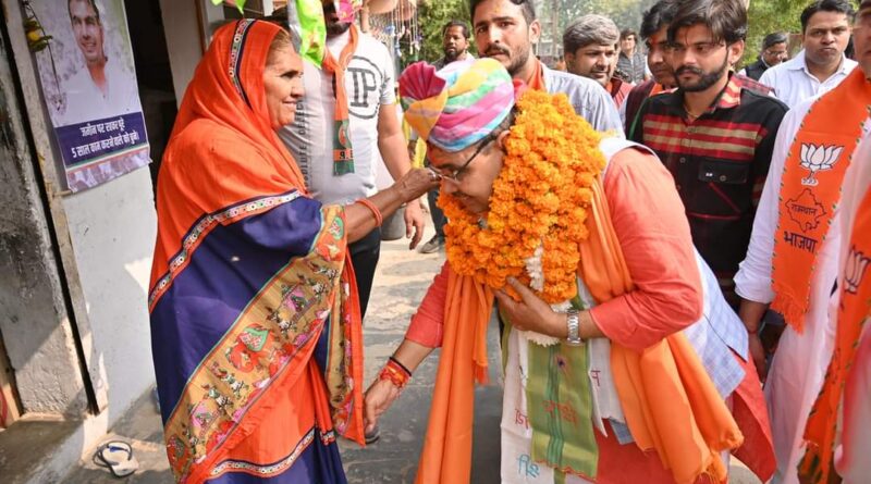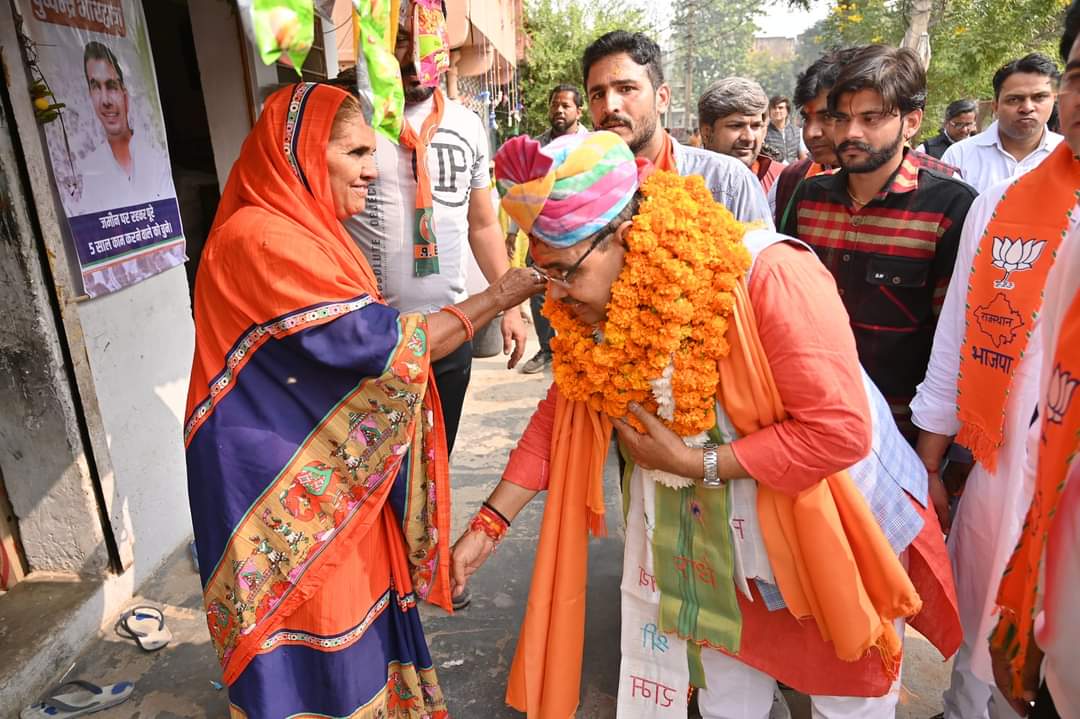जयपुर।विधानसभा प्रत्याशी भजनलाल शर्मा ने जनता से जनसंपर्क के दौरान आशीर्वाद ले आगामी 25 नवंबर को कमल का बटन दबाकर बीजेपी को विजई बनाने का आव्हान किया।
